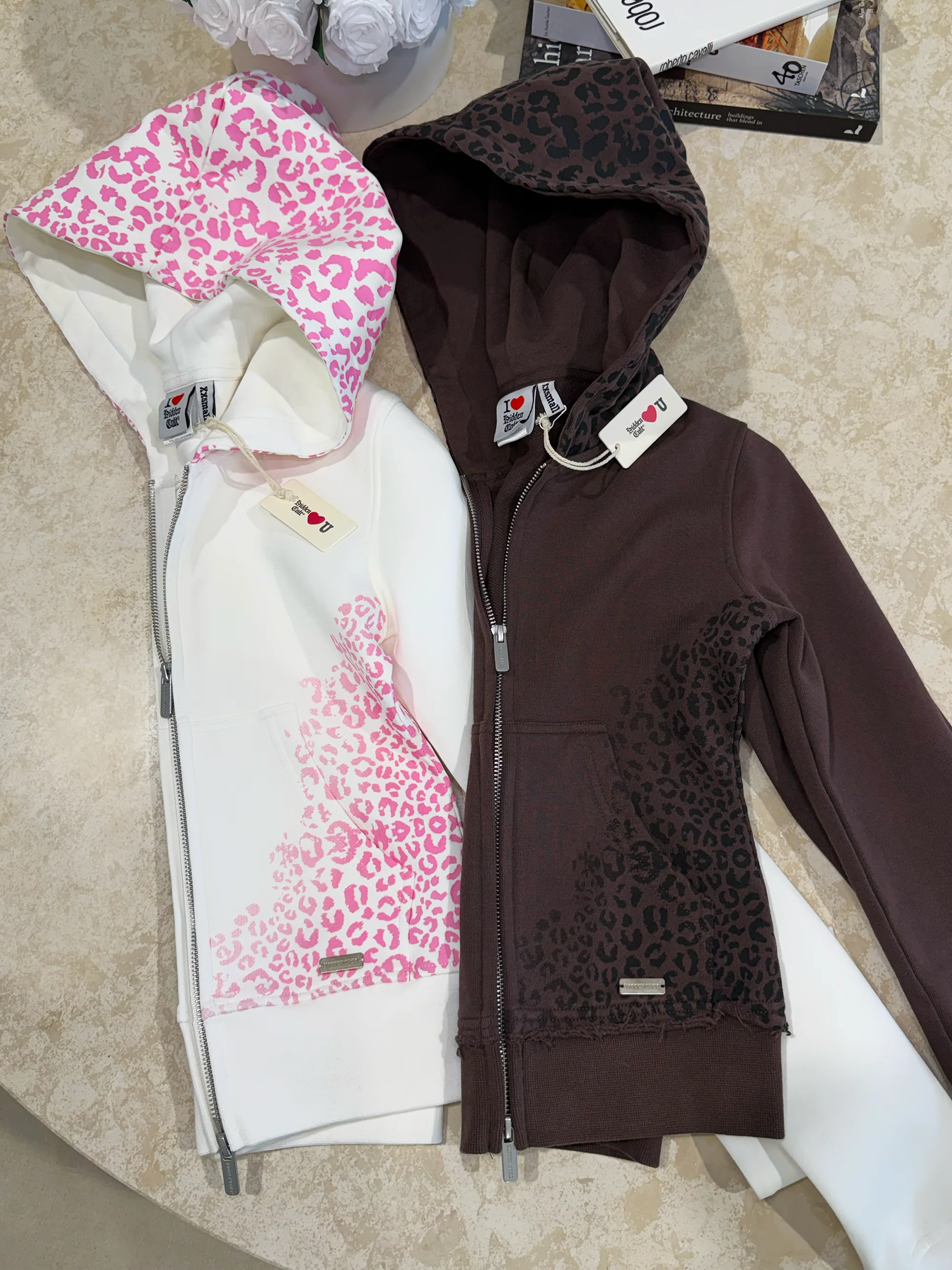Original Design by HIDDEN CULT®. Crafted from premium 100% GOTS-certified cotton, this dark brown zip hoodie is designed with a snug fit and soft stretch waist. Featuring a gradient black cheetah print hugging the waist and a matching cheetah pattern on the hood. Detailed with distressed trims at the waist and cuffs, a two-way matte silver zipper with engraved pullers and elastic wrist cuffs for comfort.